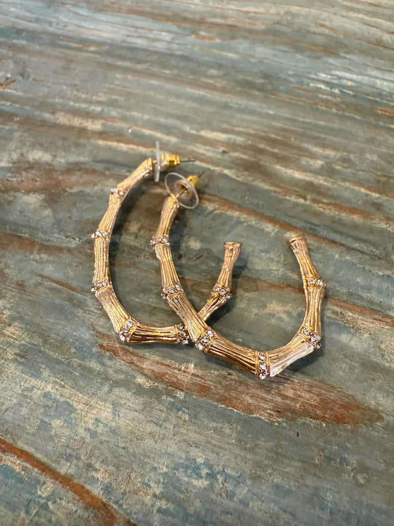 Gold Bamboo Hoop Earrings with Crystal Accents